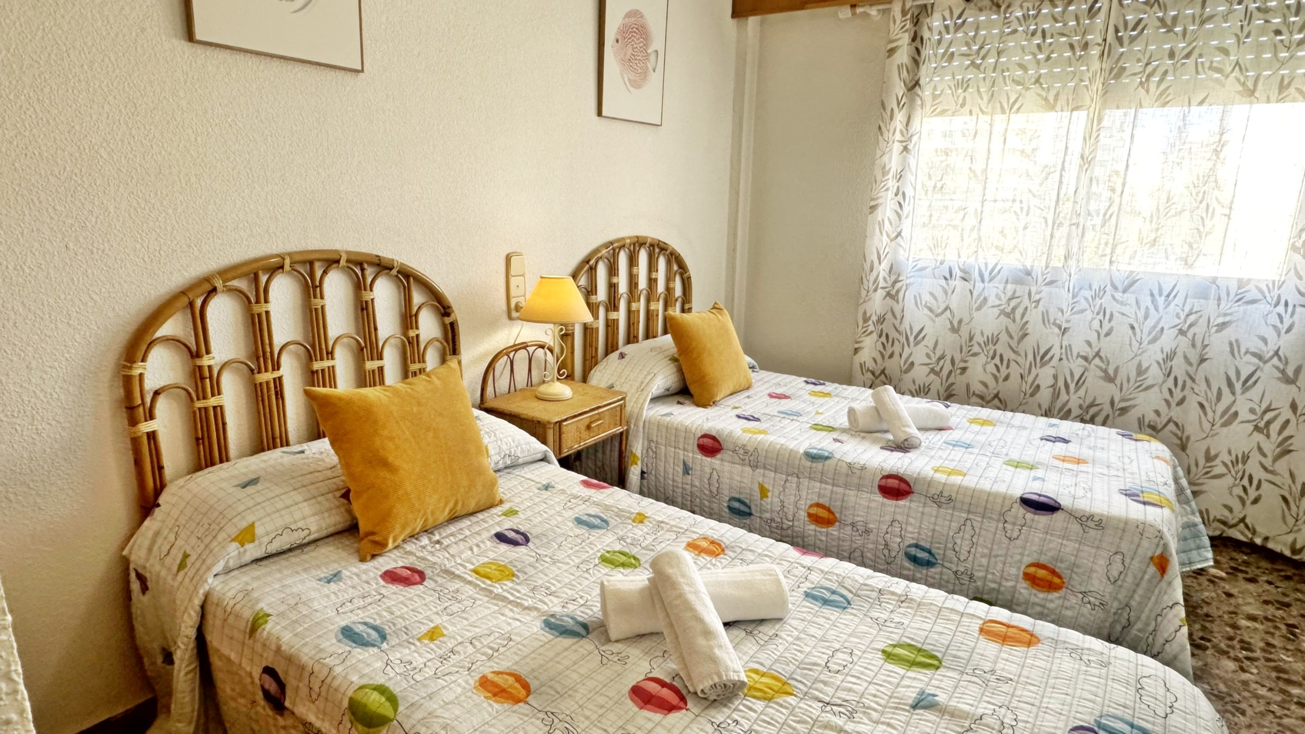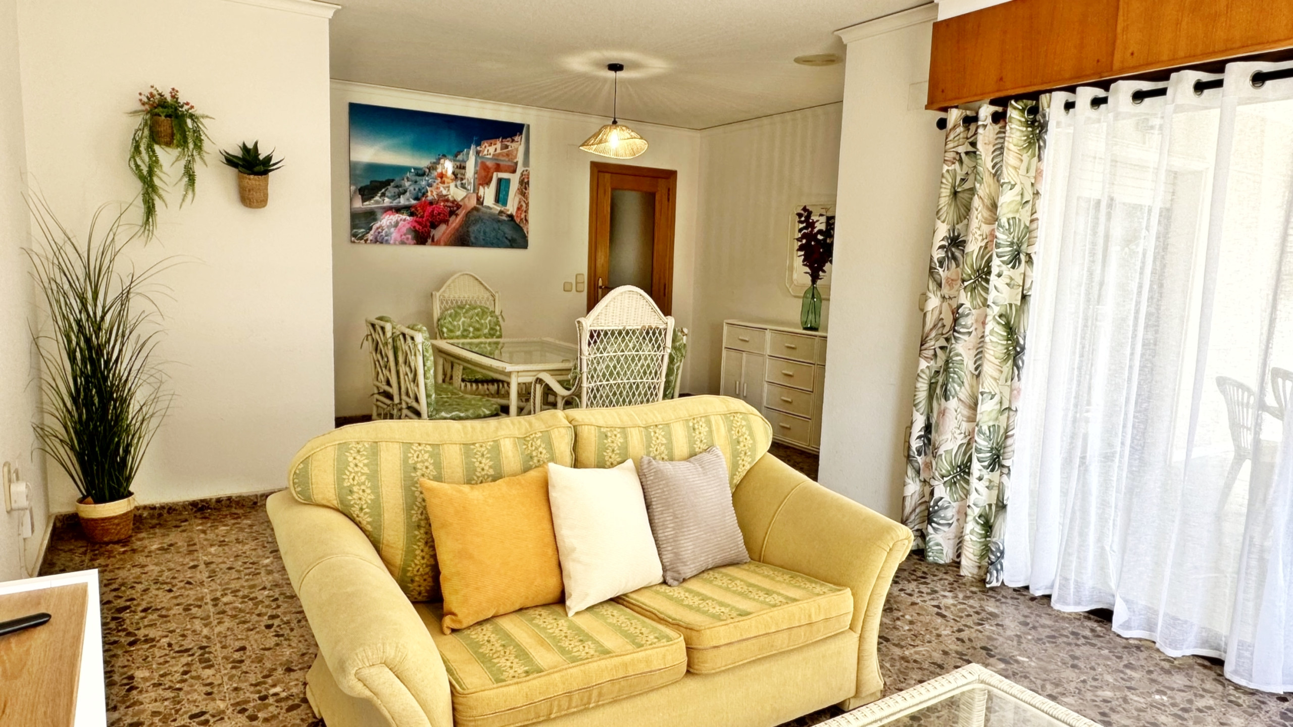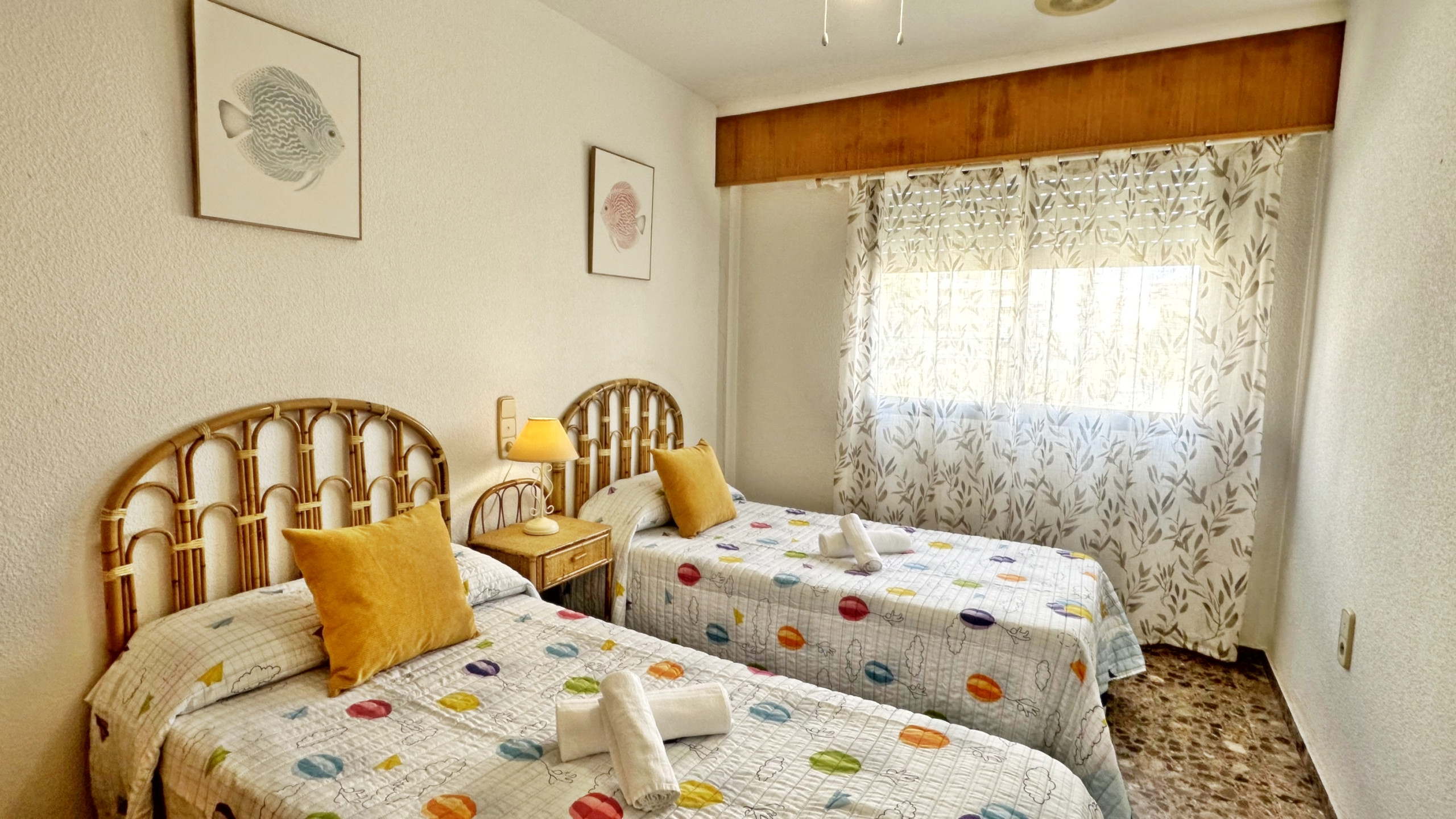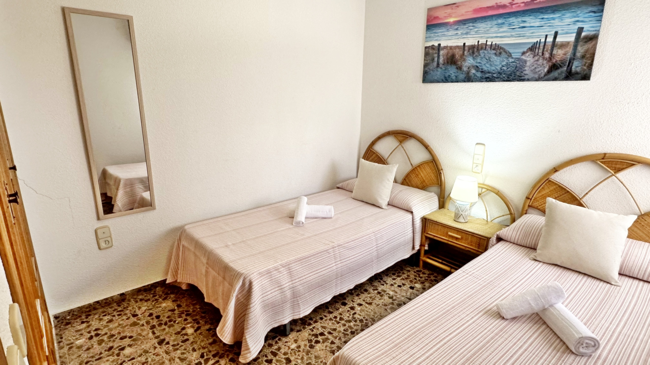 CONSTA DE: 3 dormitorios con cama de matrimonio, un cuarto de baño con ducha. Salón comedor con una cama plegable para 1 persona. En uno de los dormitorios, (dormitorio de color amarillo) hay un ventilador de techo. Cocina independiente totalmente equipada con vitro. Gran terraza con vistas laterales a la playa.