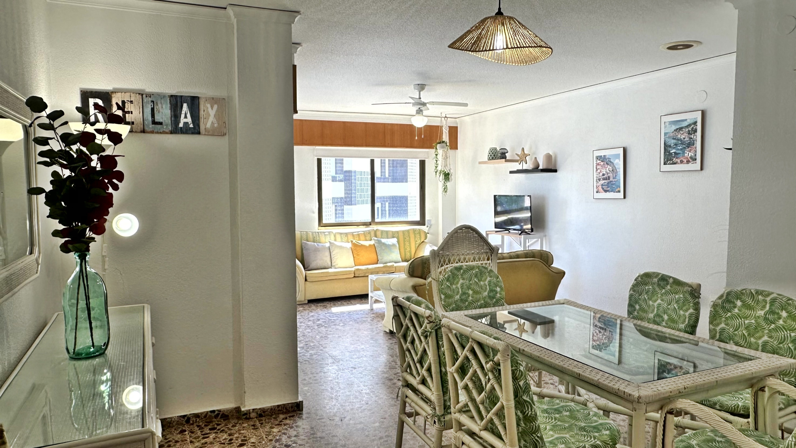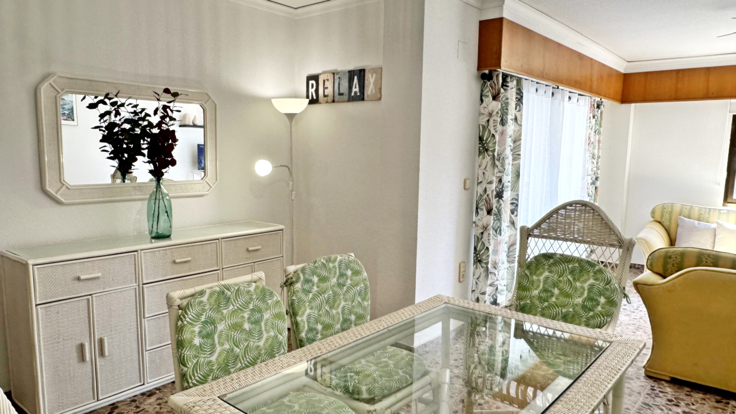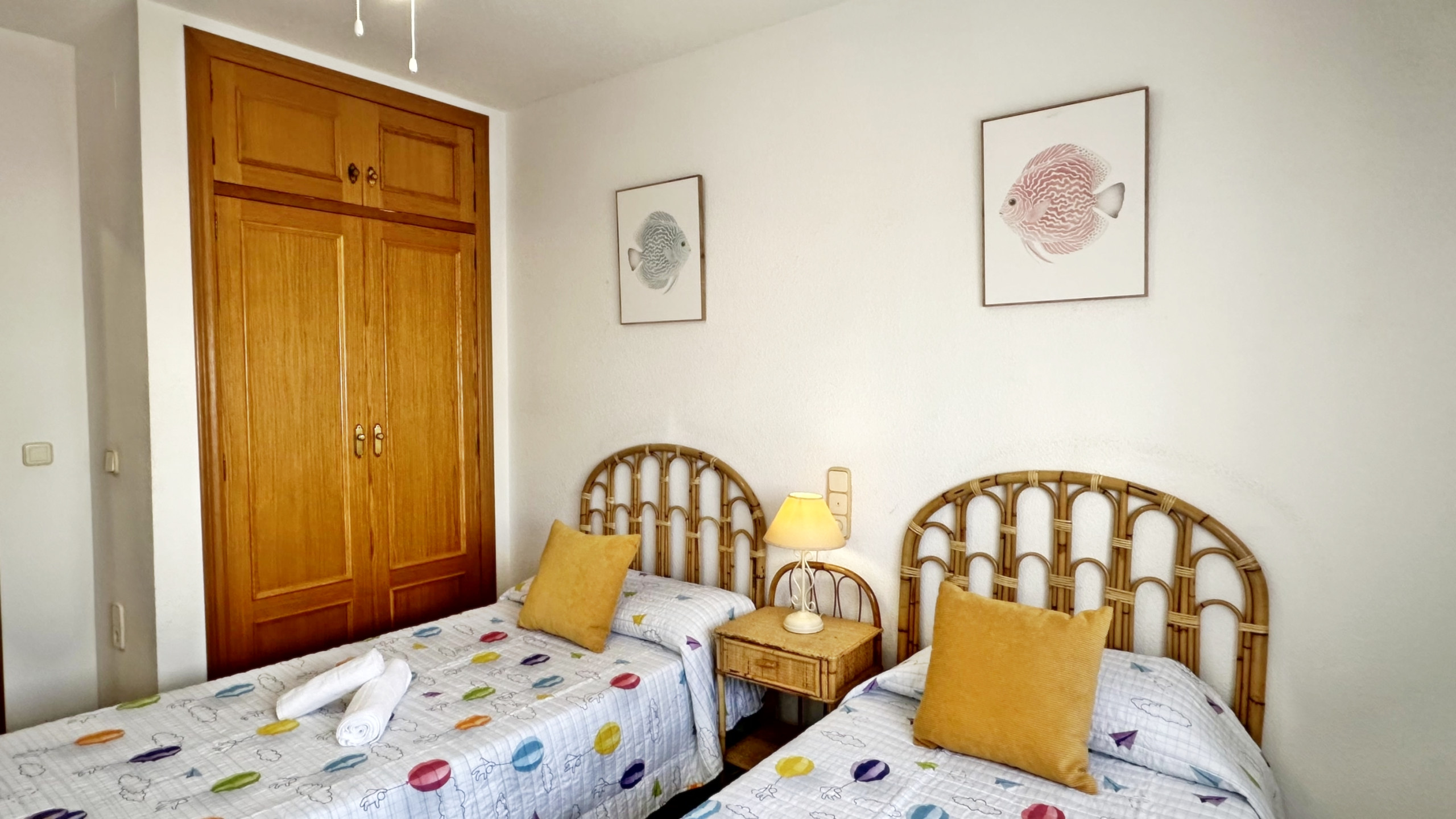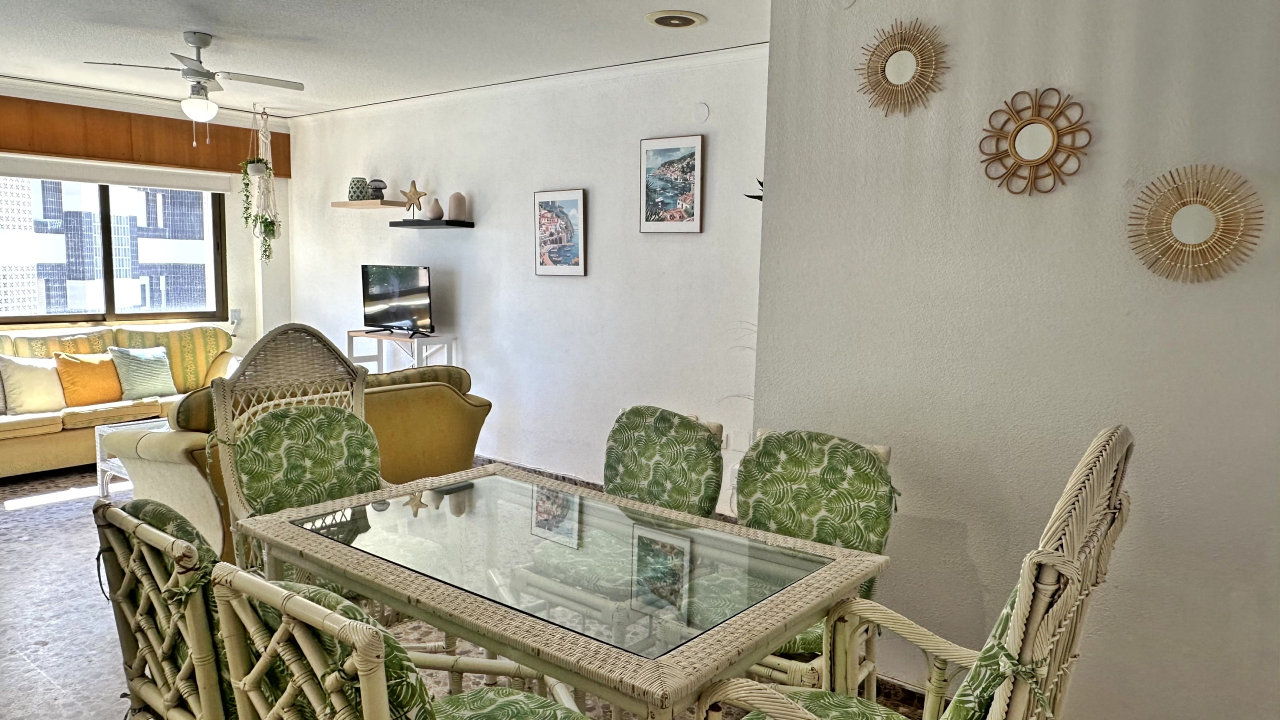 CONSTA DE: 3 dormitorios con cama de matrimonio, un cuarto de baño con ducha. Salón comedor con una cama plegable para 1 persona. En uno de los dormitorios, (dormitorio de color amarillo) hay un ventilador de techo. Cocina independiente totalmente equipada con vitro. Gran terraza con vistas laterales a la playa.