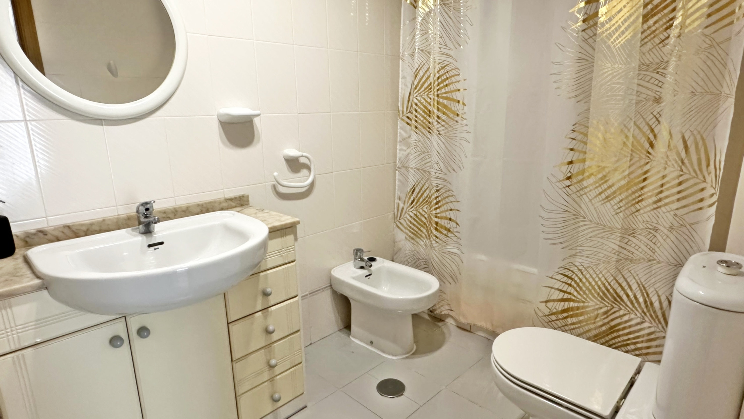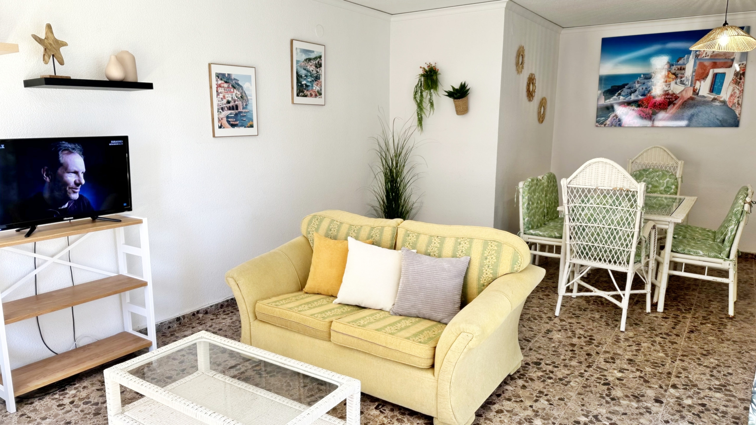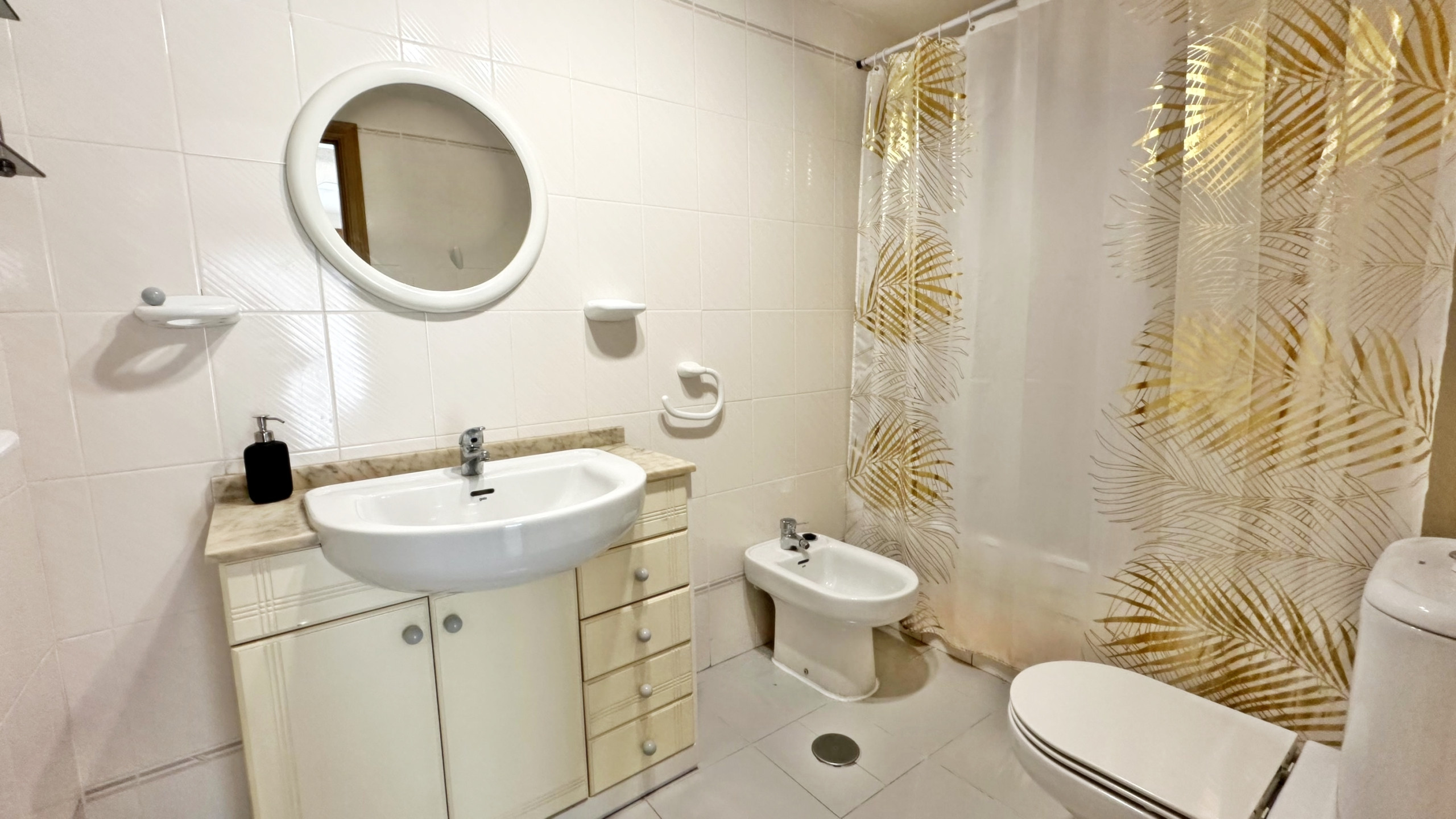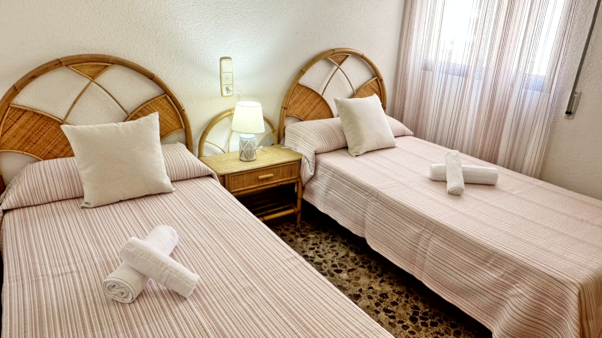 CONSTA DE: 3 dormitorios con cama de matrimonio, un cuarto de baño con ducha. Salón comedor con una cama plegable para 1 persona. En uno de los dormitorios, (dormitorio de color amarillo) hay un ventilador de techo. Cocina independiente totalmente equipada con vitro. Gran terraza con vistas laterales a la playa.