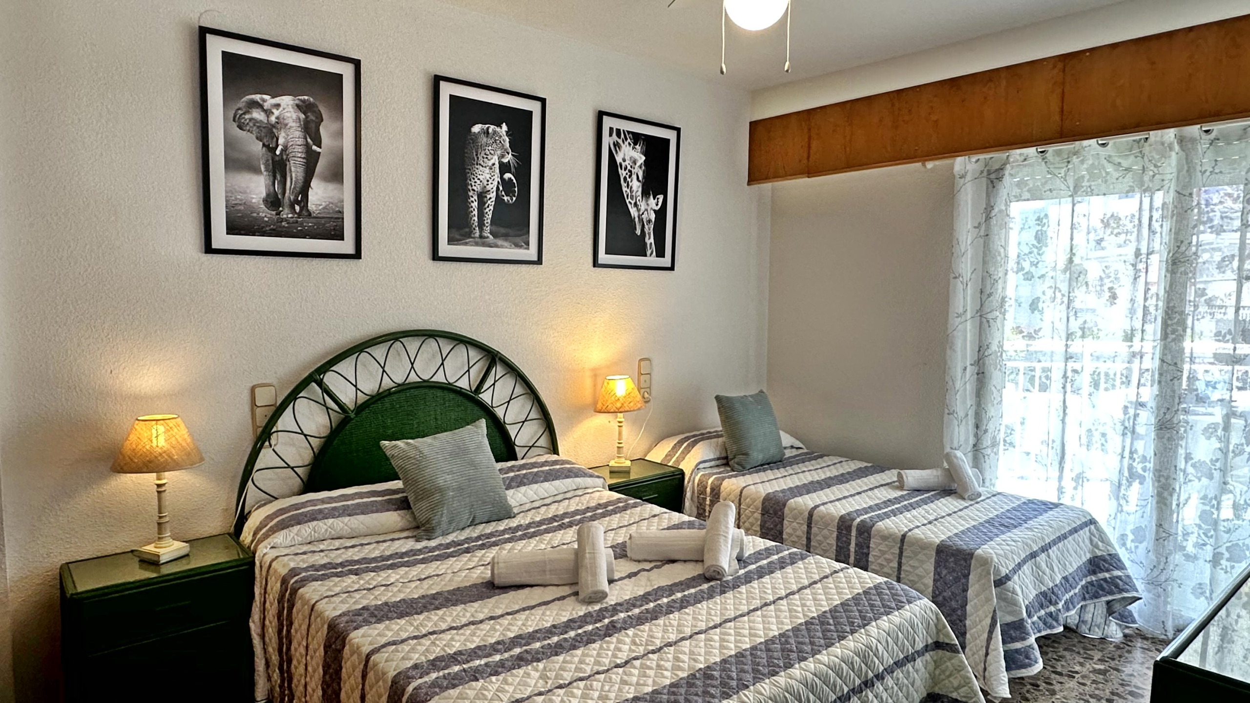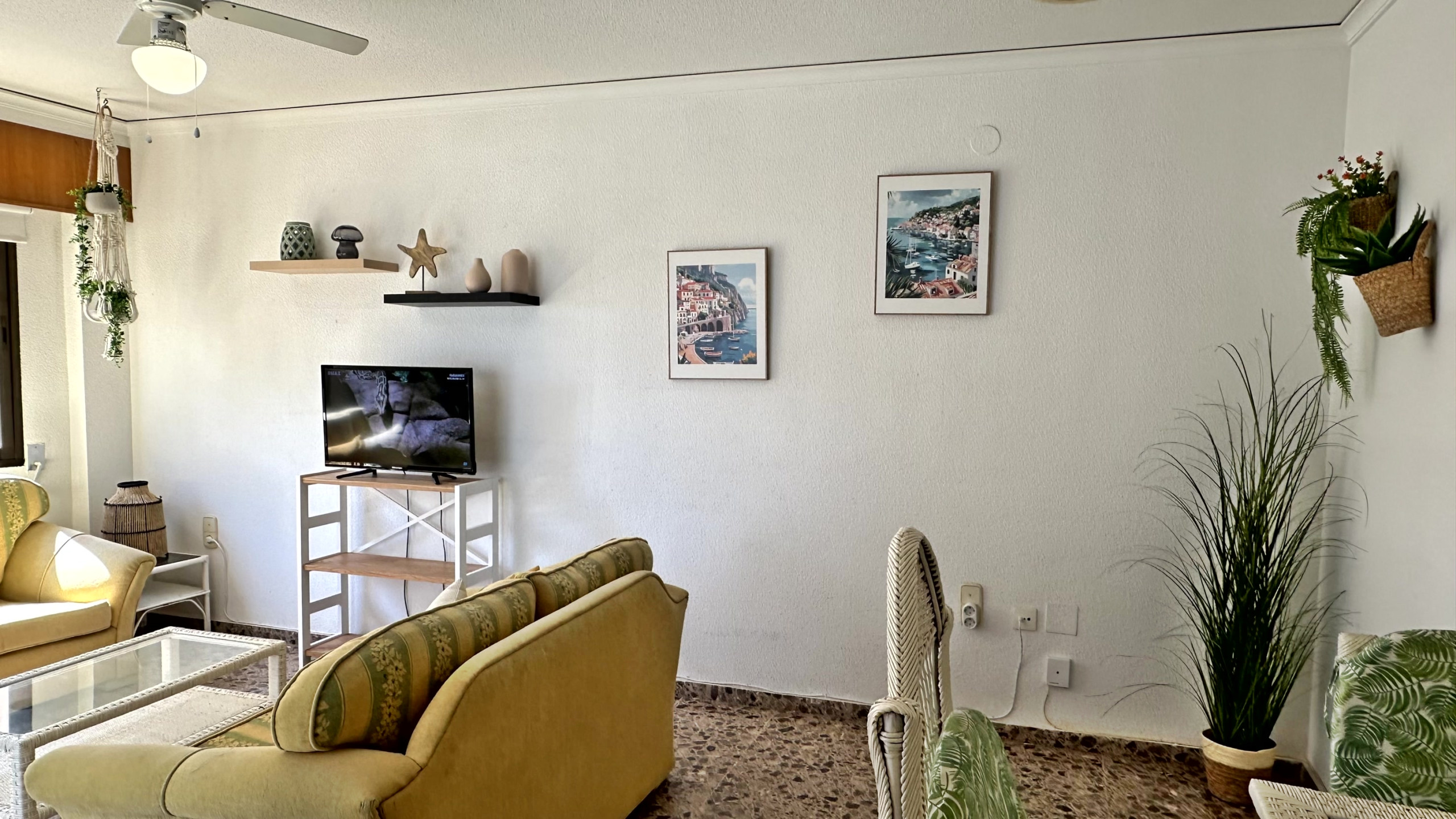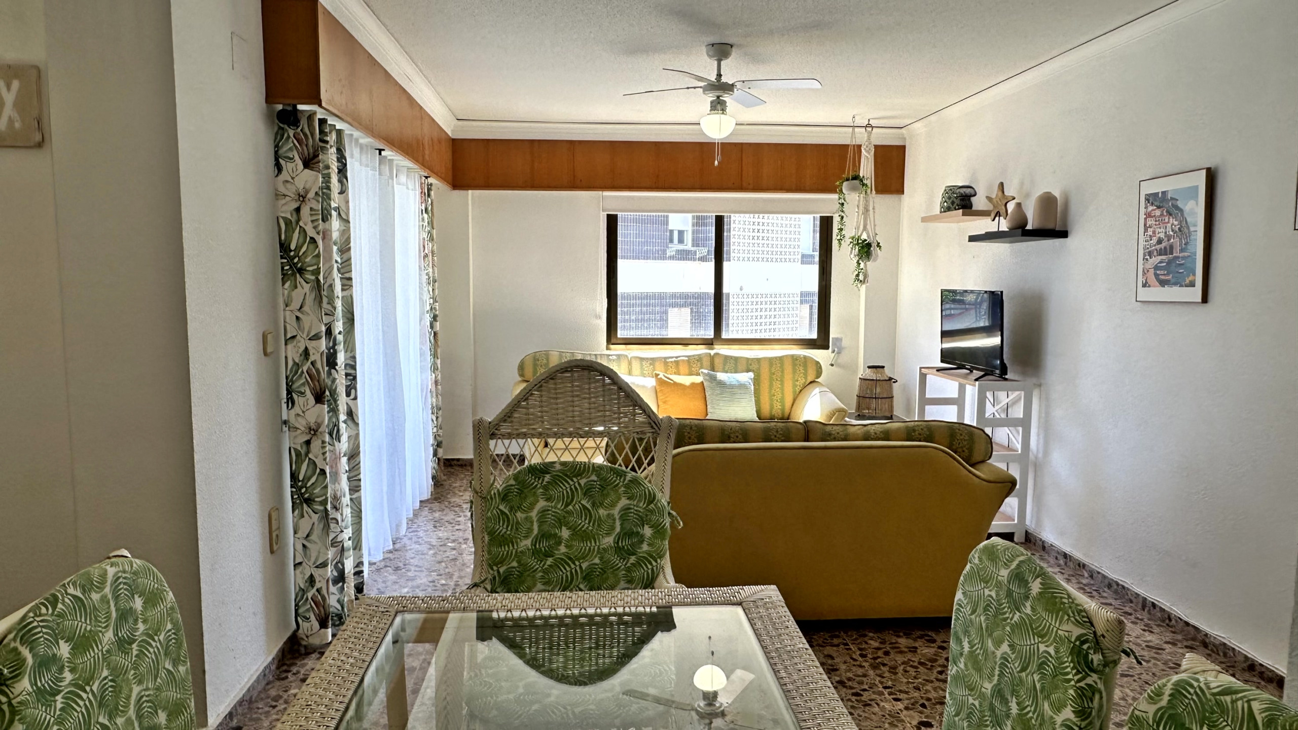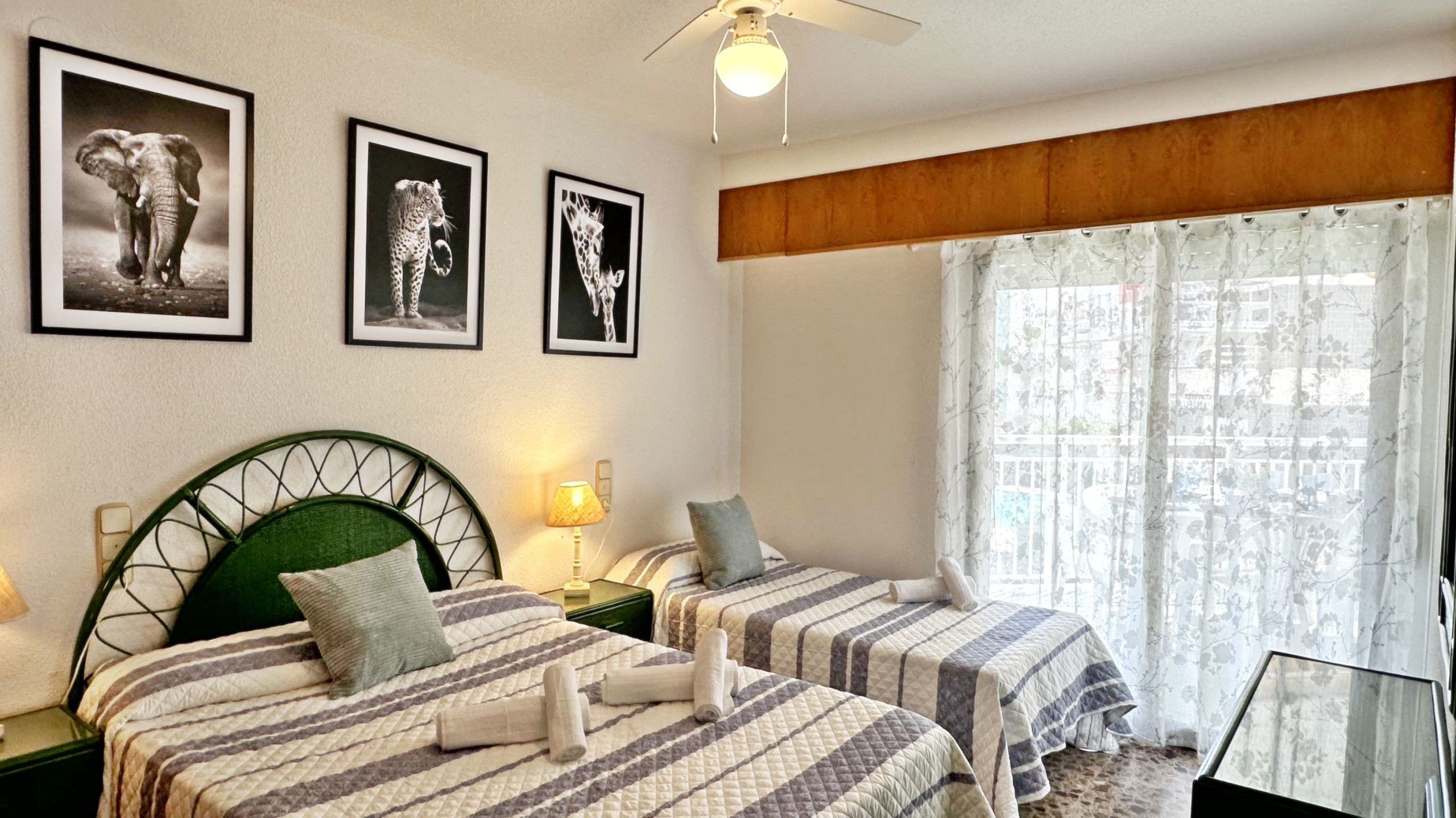 3 dormitorios y el salón con ventilador de techo.