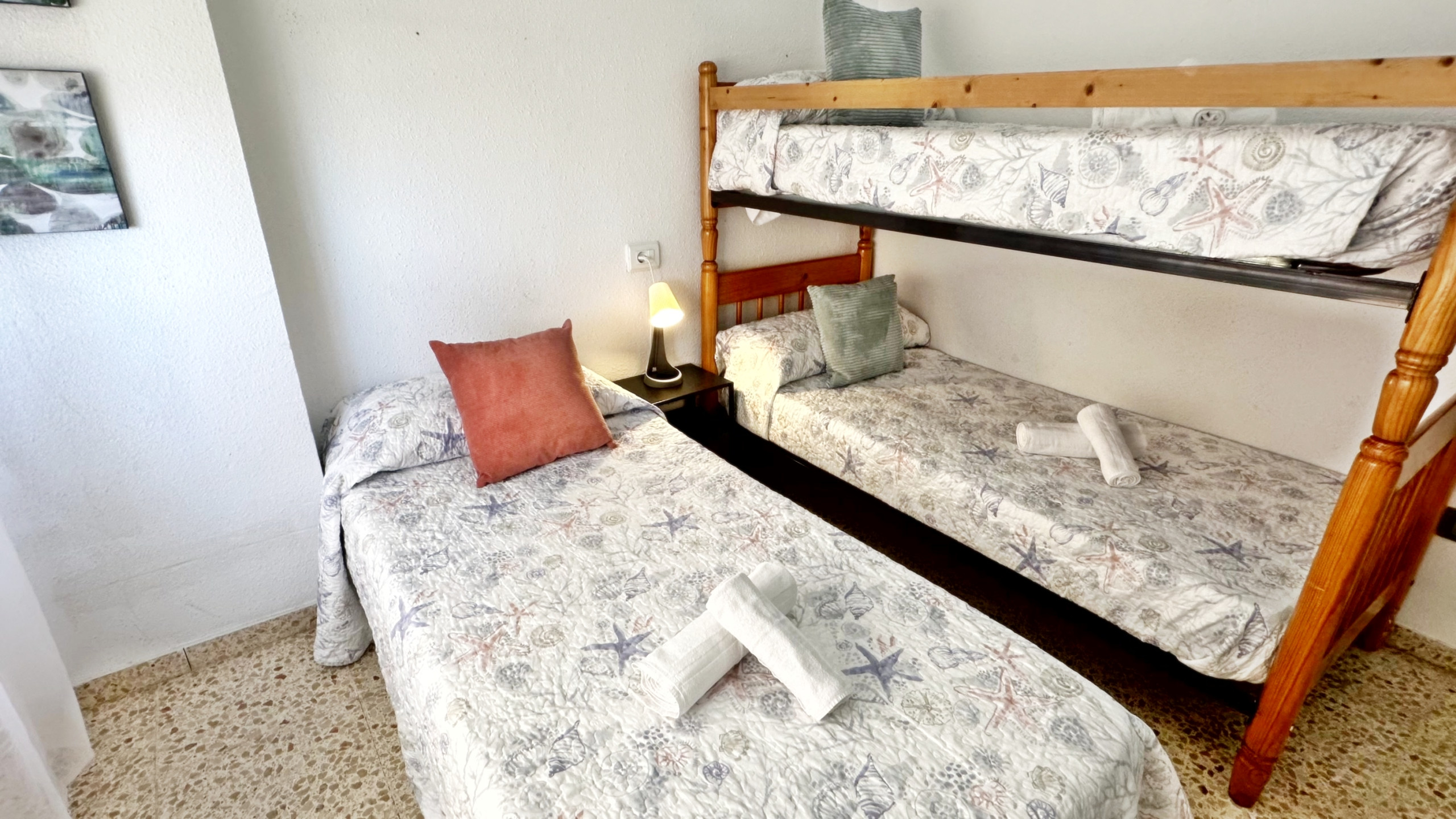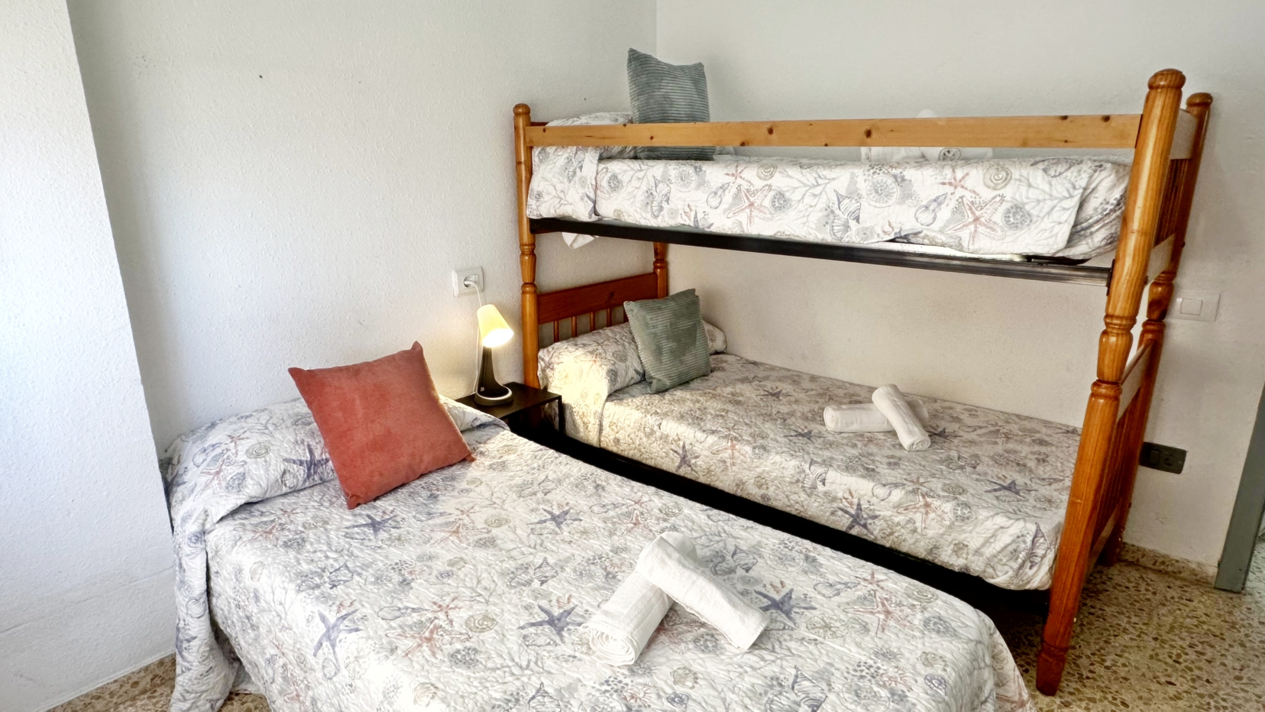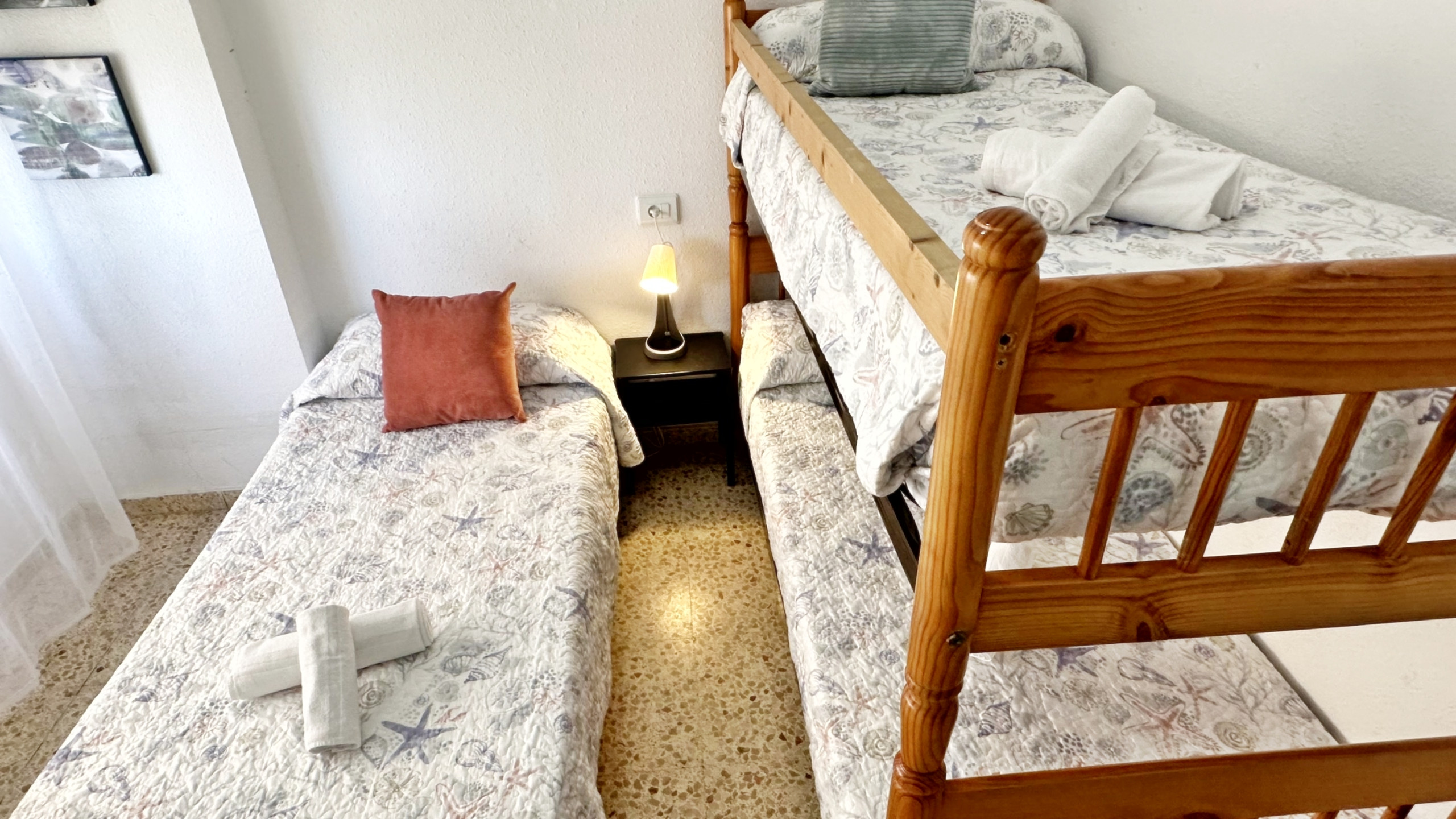 Consta de: 2 dormitorios ( 1 dormitorios con dos camas y otro con una litera y una cama individual) , salón, cocina independiente totalmente equipada, 1 cuarto de baño completo con ducha .