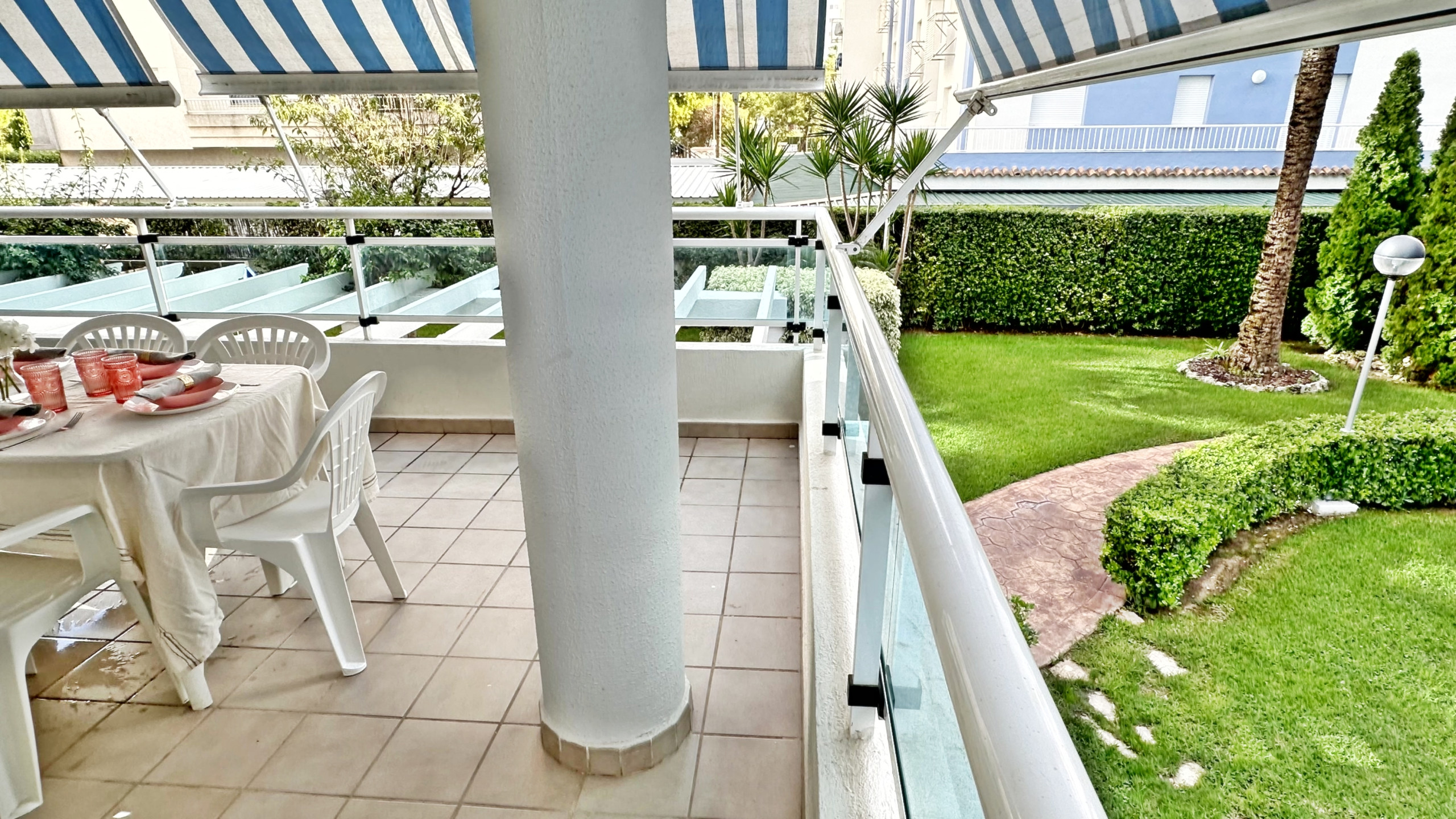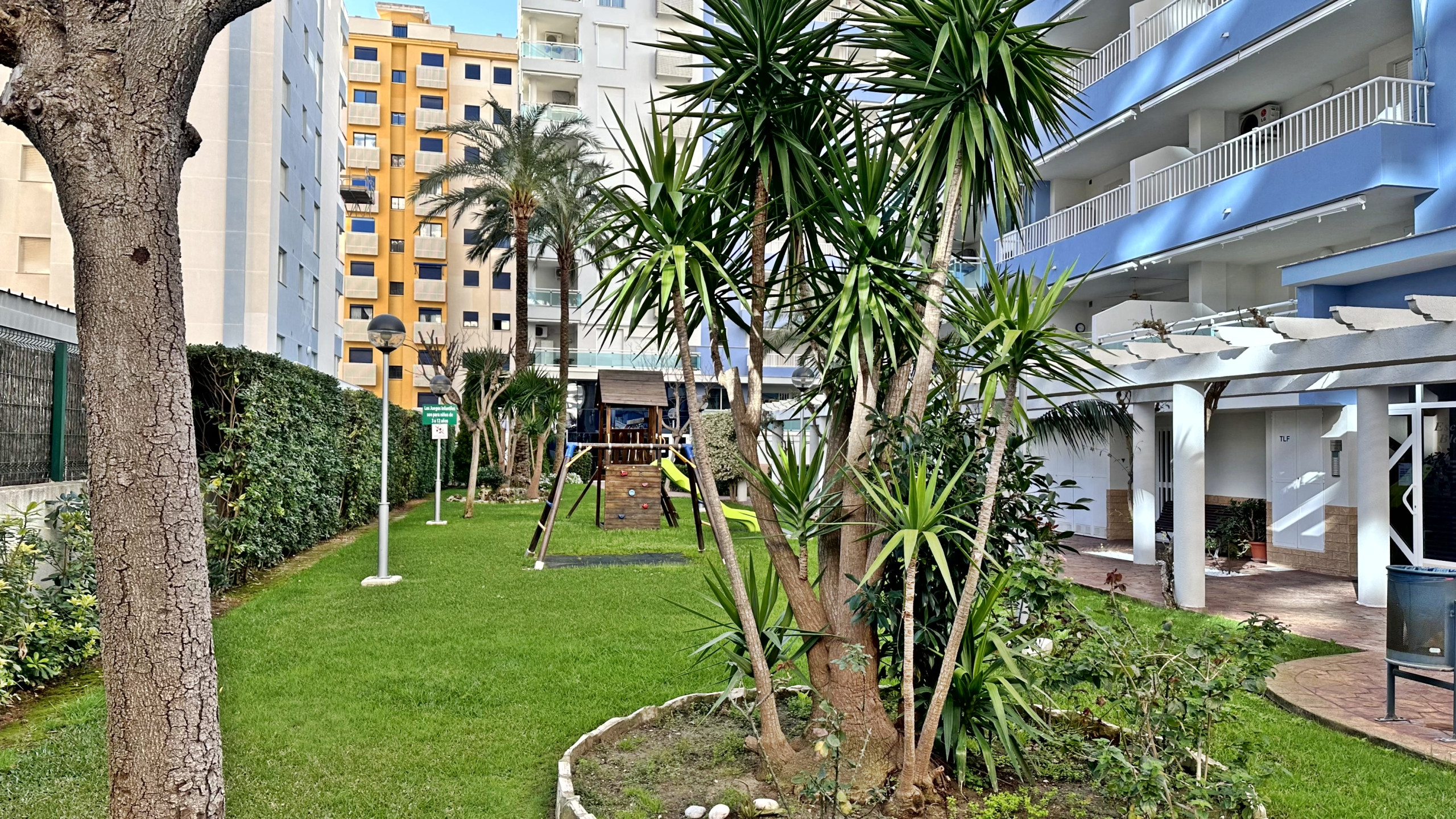 El apartamento dispone de 3 dormitorios dobles: uno con cama de matrimonio y dos con camas individuales, ofreciendo capacidad y confort para todos los huéspedes. Cuenta con 2 cuartos de baño, uno equipado con bañera y otro con ducha. Gran terraza amueblada con vistas al jardín y a la piscina.
