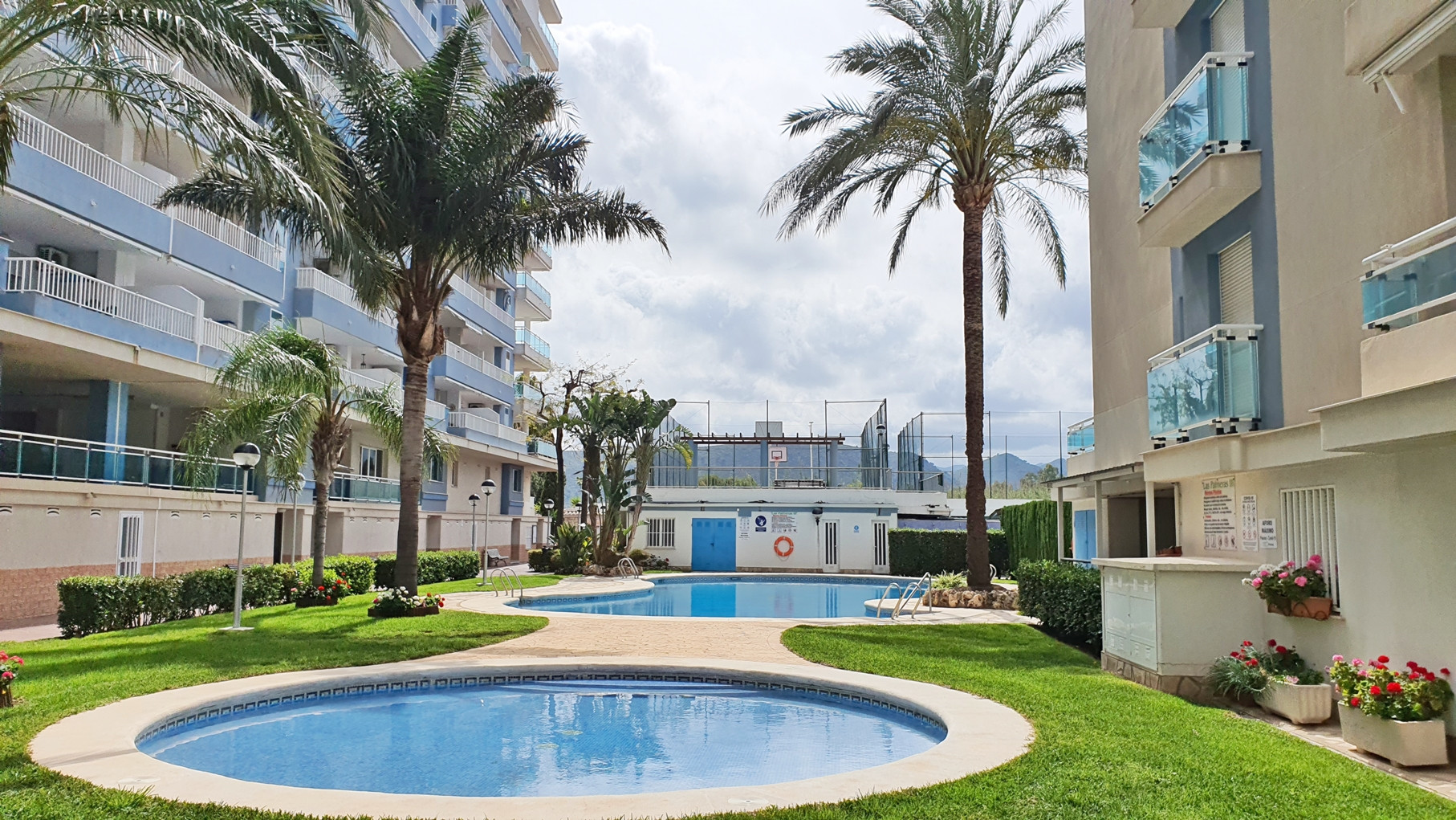 La urbanización cuenta con extensas zonas ajardinadas, área infantil, piscina grande y piscina pequeña para niños, además de zonas deportivas y una cancha de tenis, creando un entorno perfecto para el ocio y el descanso.