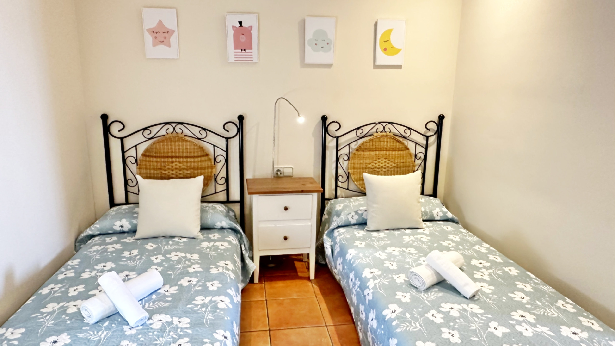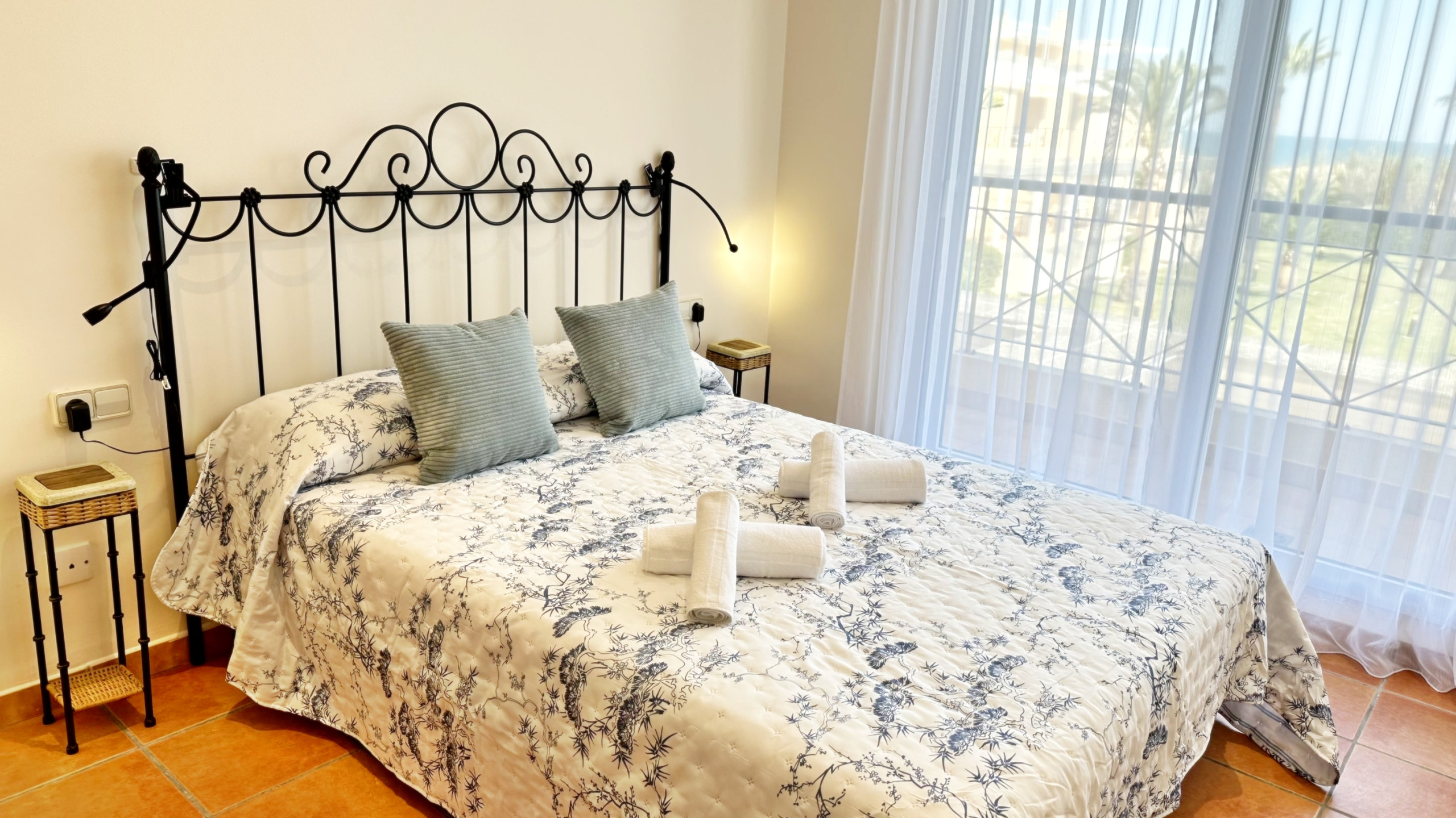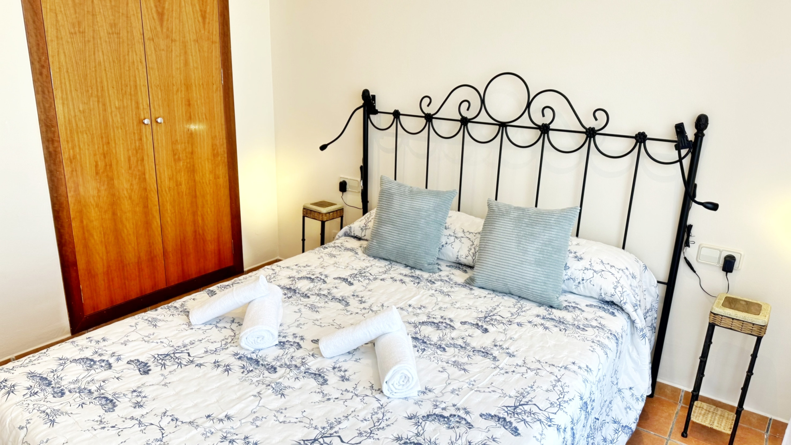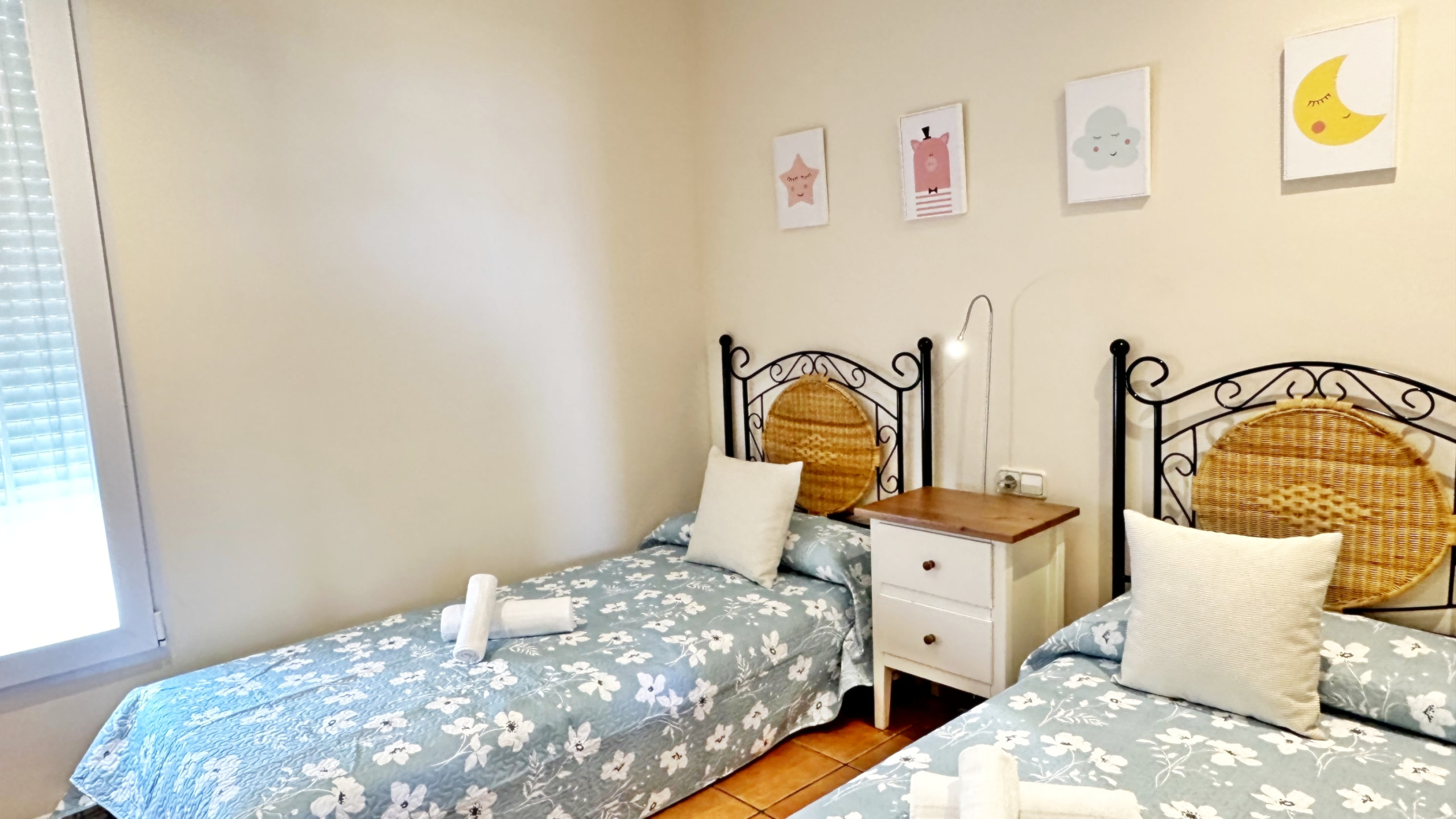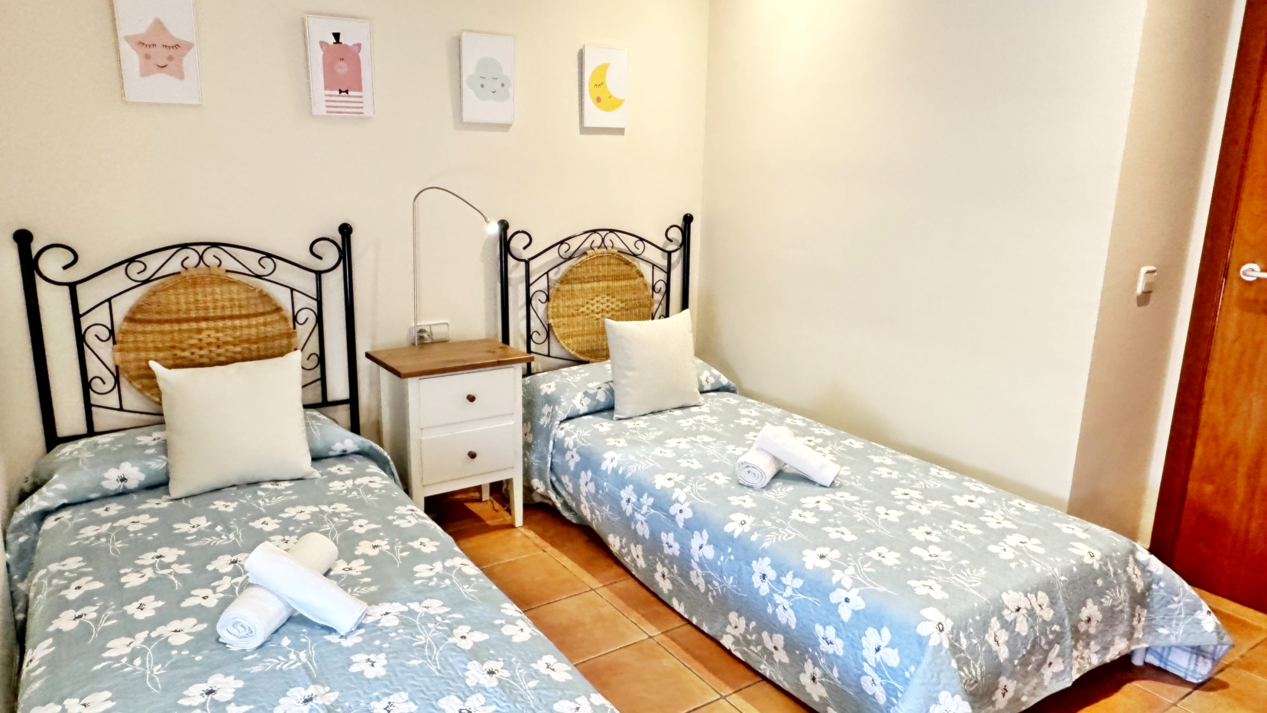 Apartamento de 2 dormitorios (1 con cama de matrimonio y uno con dos camas individuales ), salón con sofá cama para 1 persona, cocina independiente totalmente equipada, 2 cuartos de baño completos ( bañera y ducha ), terraza con salida desde el salón con vistas a la piscina y al mar, y una terraza solárium en azotea con acceso desde el interior privada.