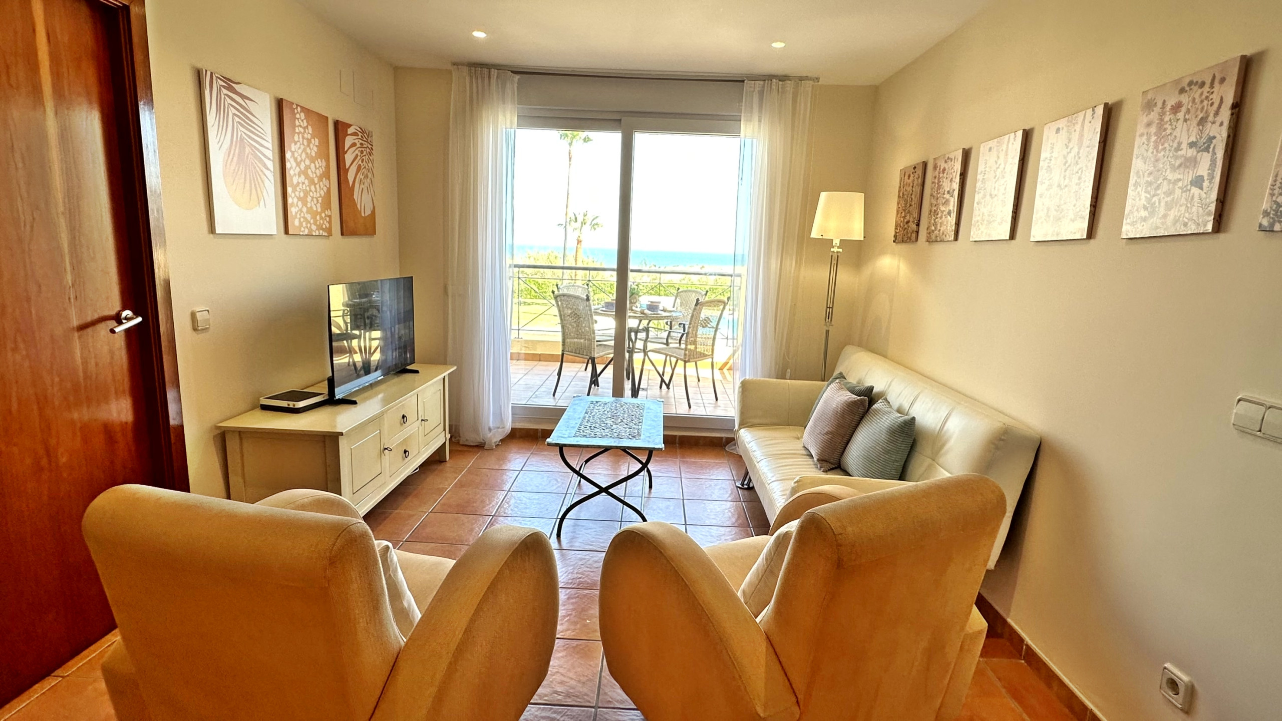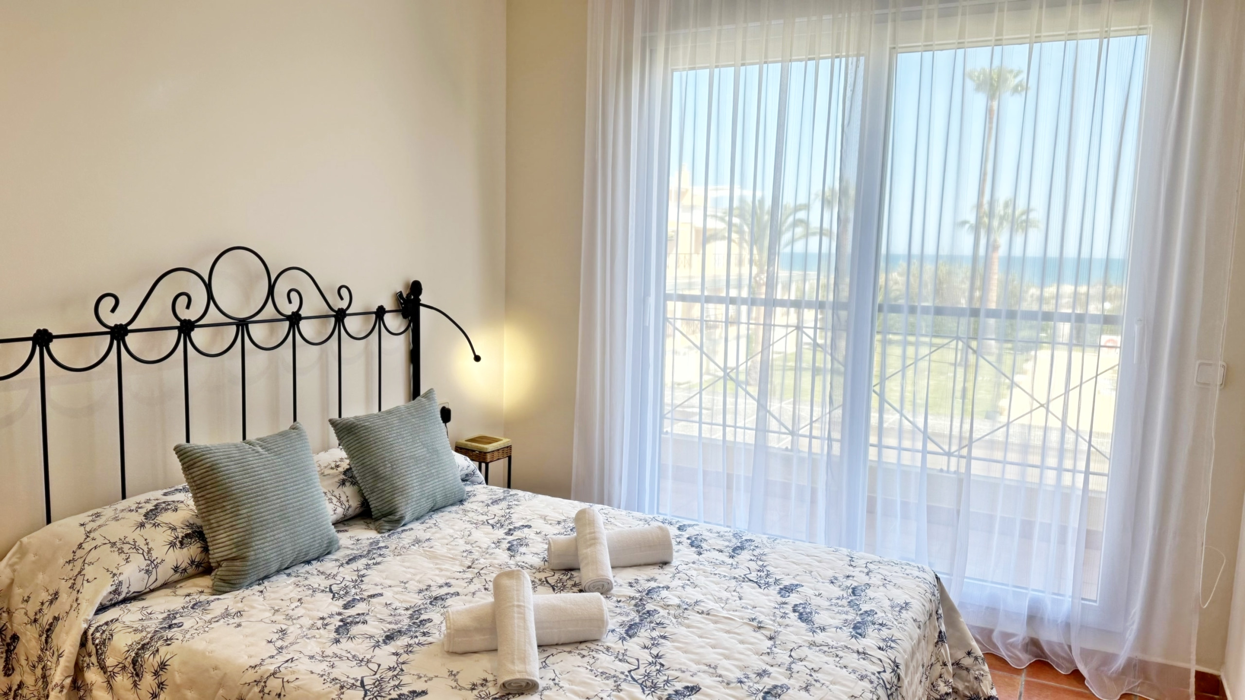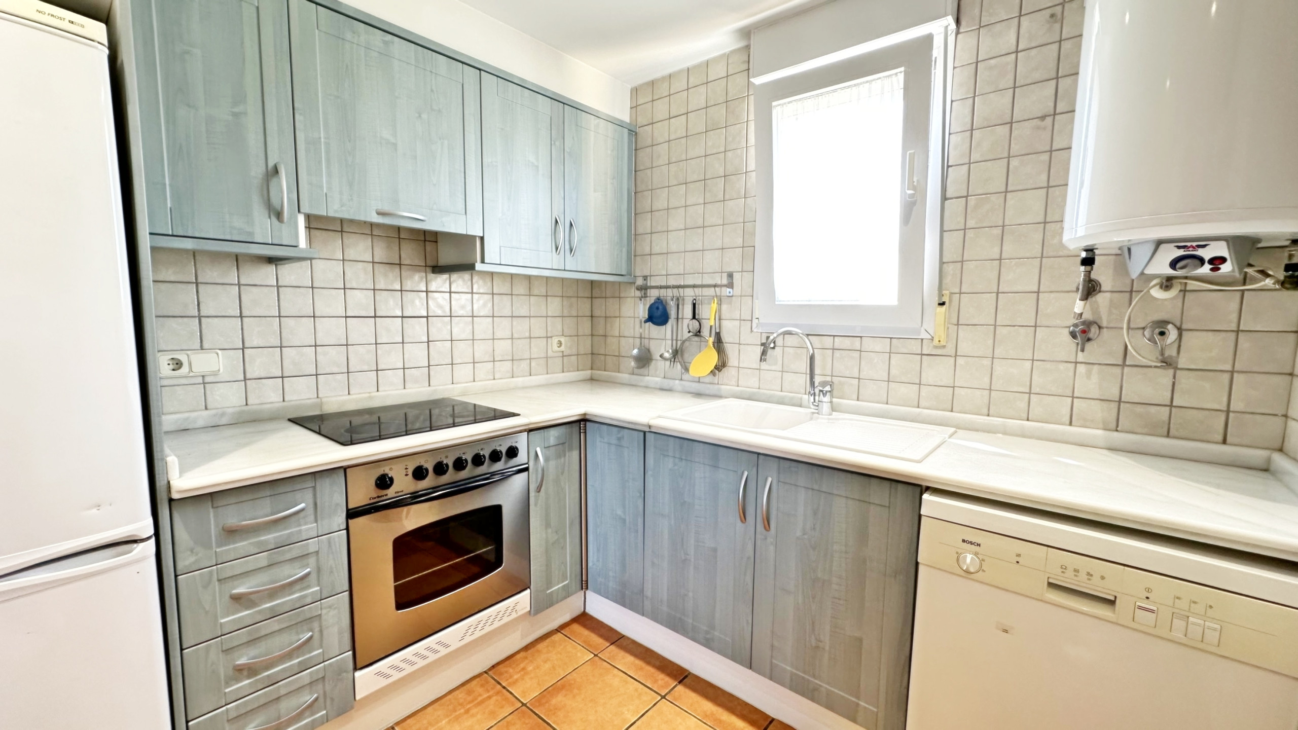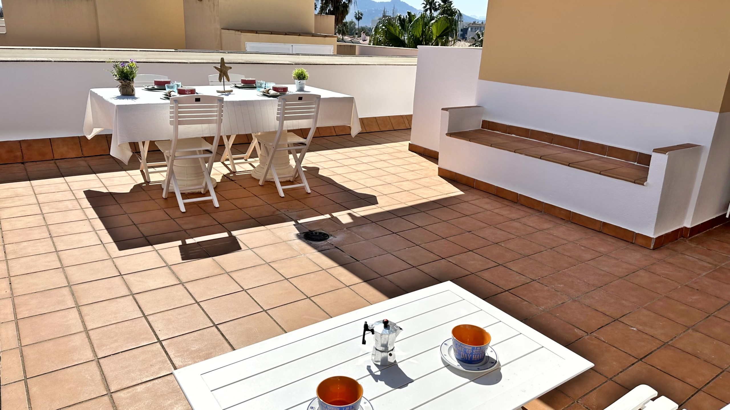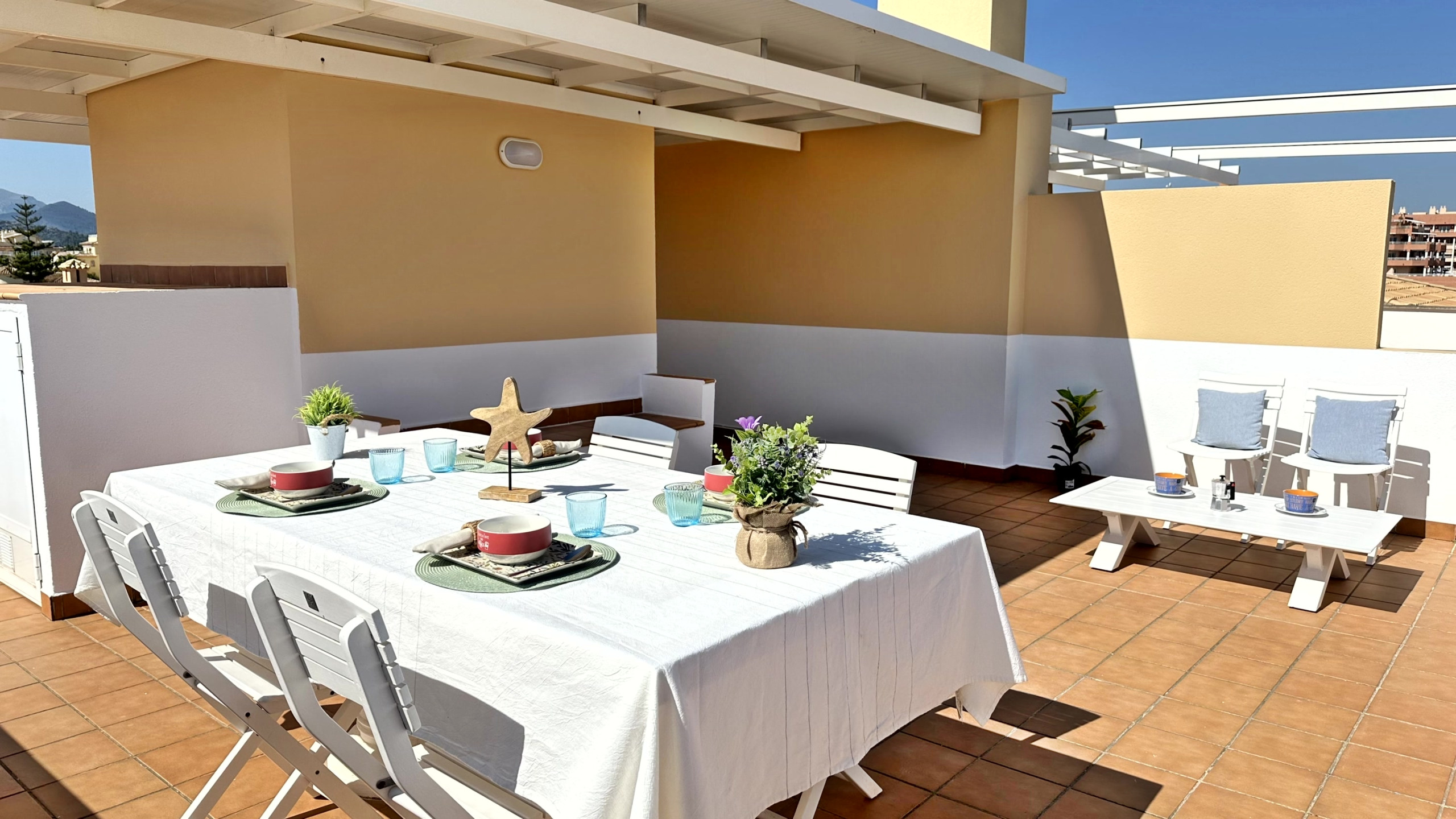 Apartamento de 2 dormitorios (1 con cama de matrimonio y uno con dos camas individuales ), salón con sofá cama para 1 persona, cocina independiente totalmente equipada, 2 cuartos de baño completos ( bañera y ducha ), terraza con salida desde el salón con vistas a la piscina y al mar, y una terraza solárium en azotea con acceso desde el interior privada.