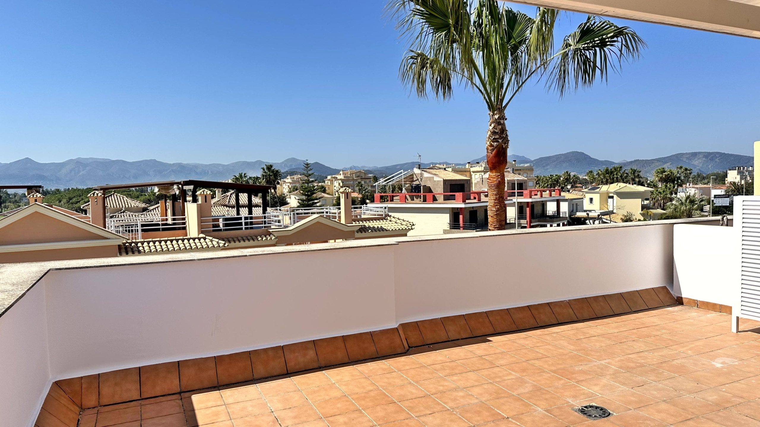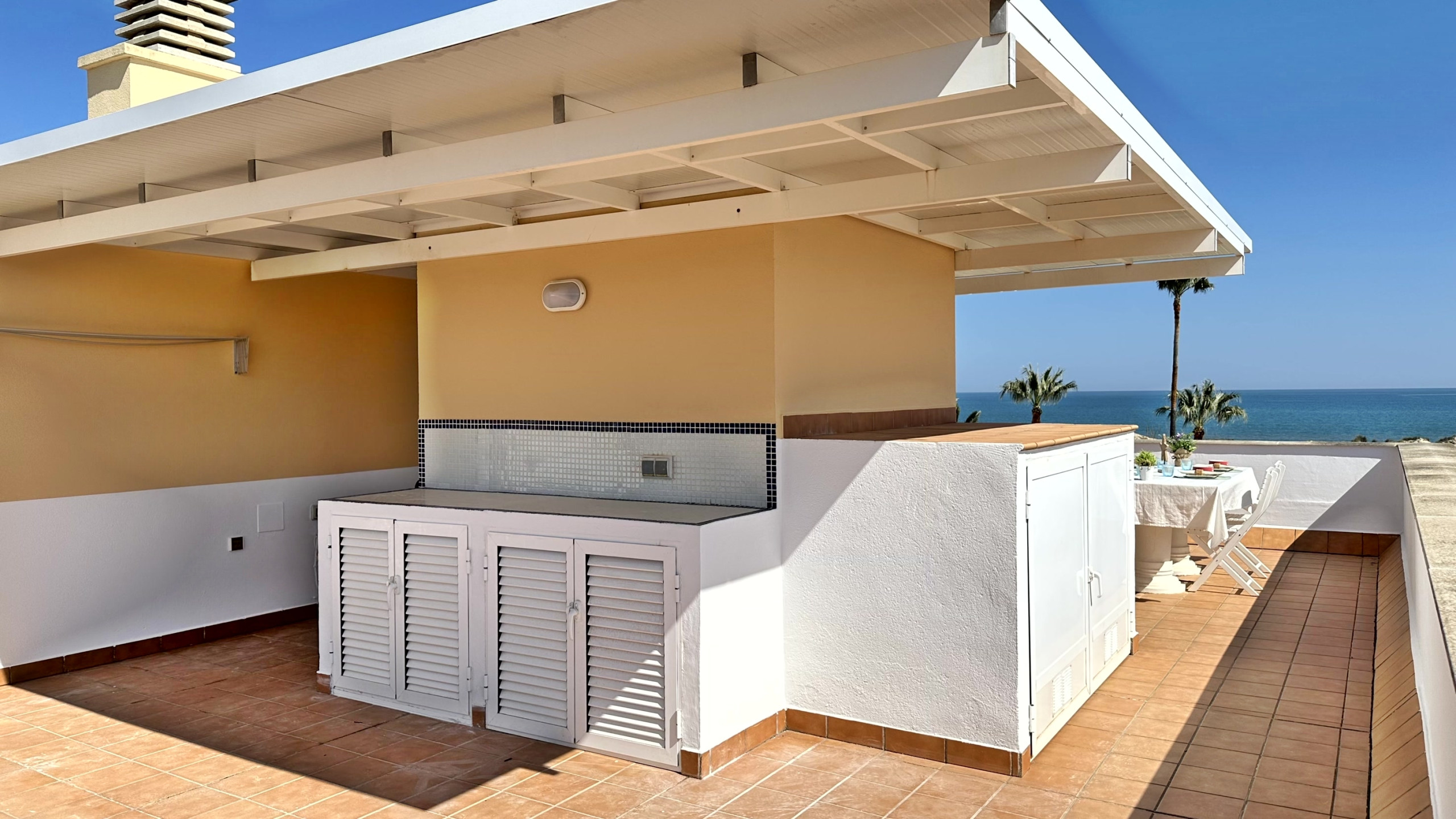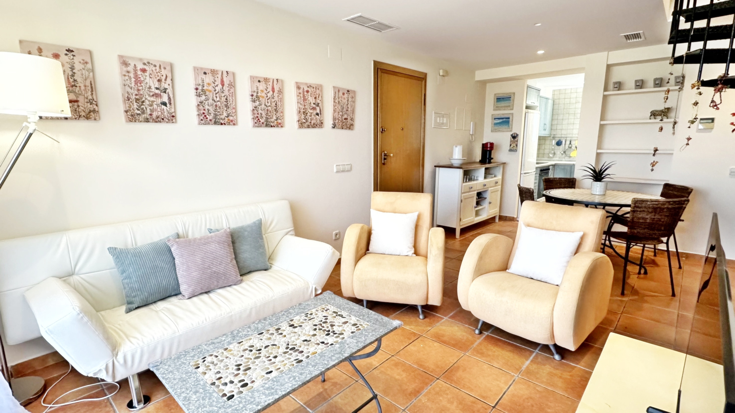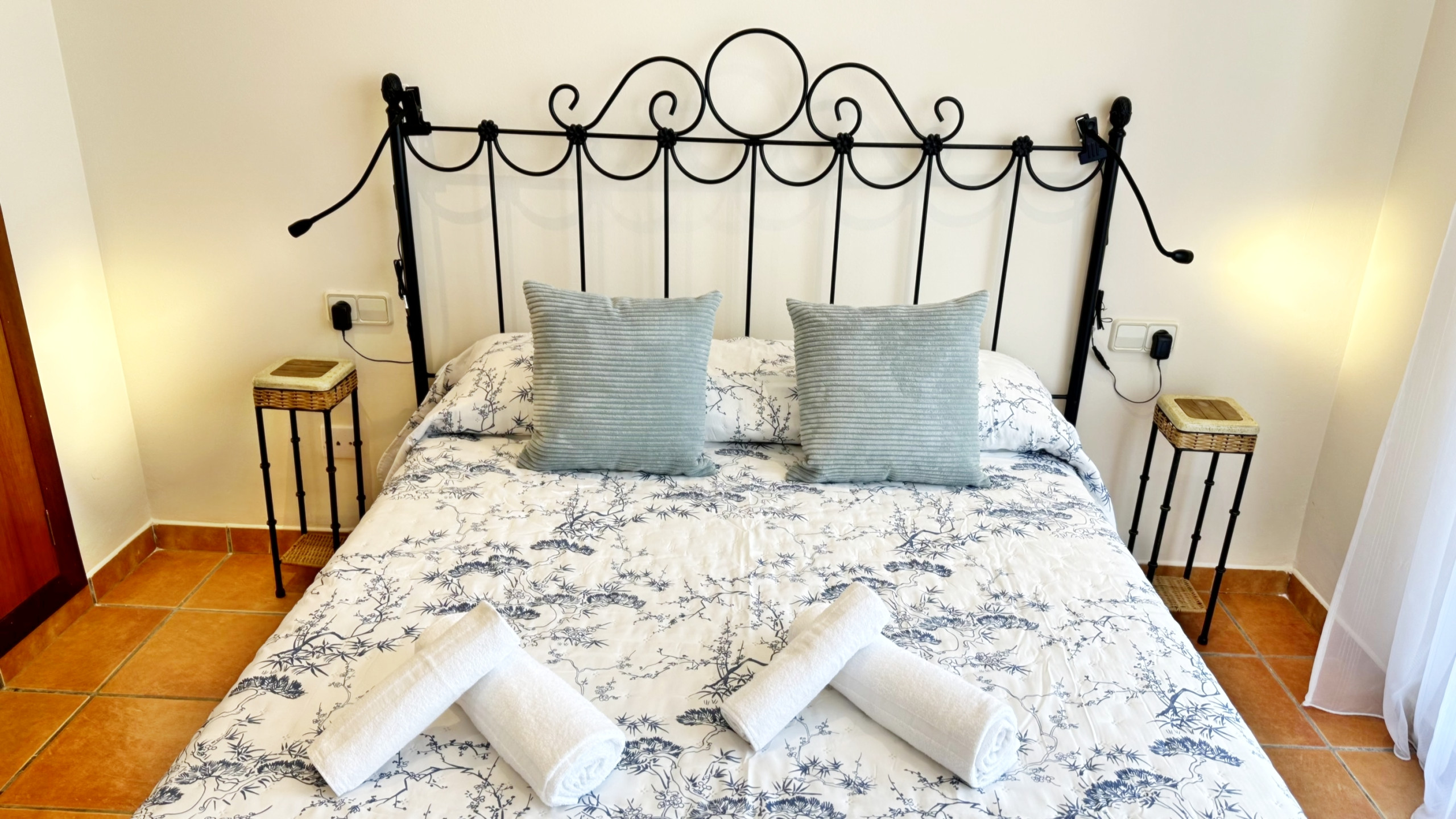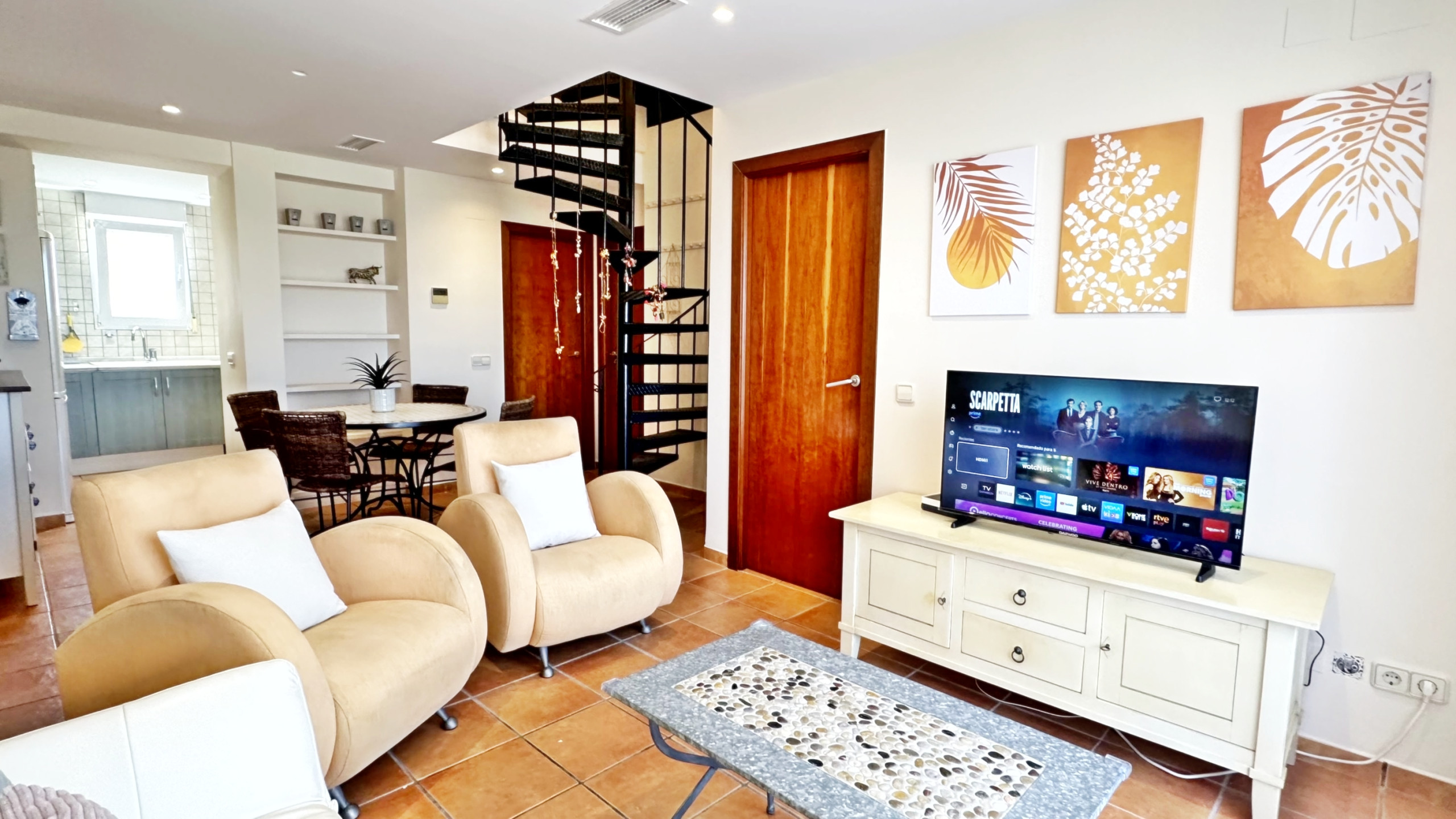 Apartamento de 2 dormitorios (1 con cama de matrimonio y uno con dos camas individuales ), salón con sofá cama para 1 persona, cocina independiente totalmente equipada, 2 cuartos de baño completos ( bañera y ducha ), terraza con salida desde el salón con vistas a la piscina y al mar, y una terraza solárium en azotea con acceso desde el interior privada.